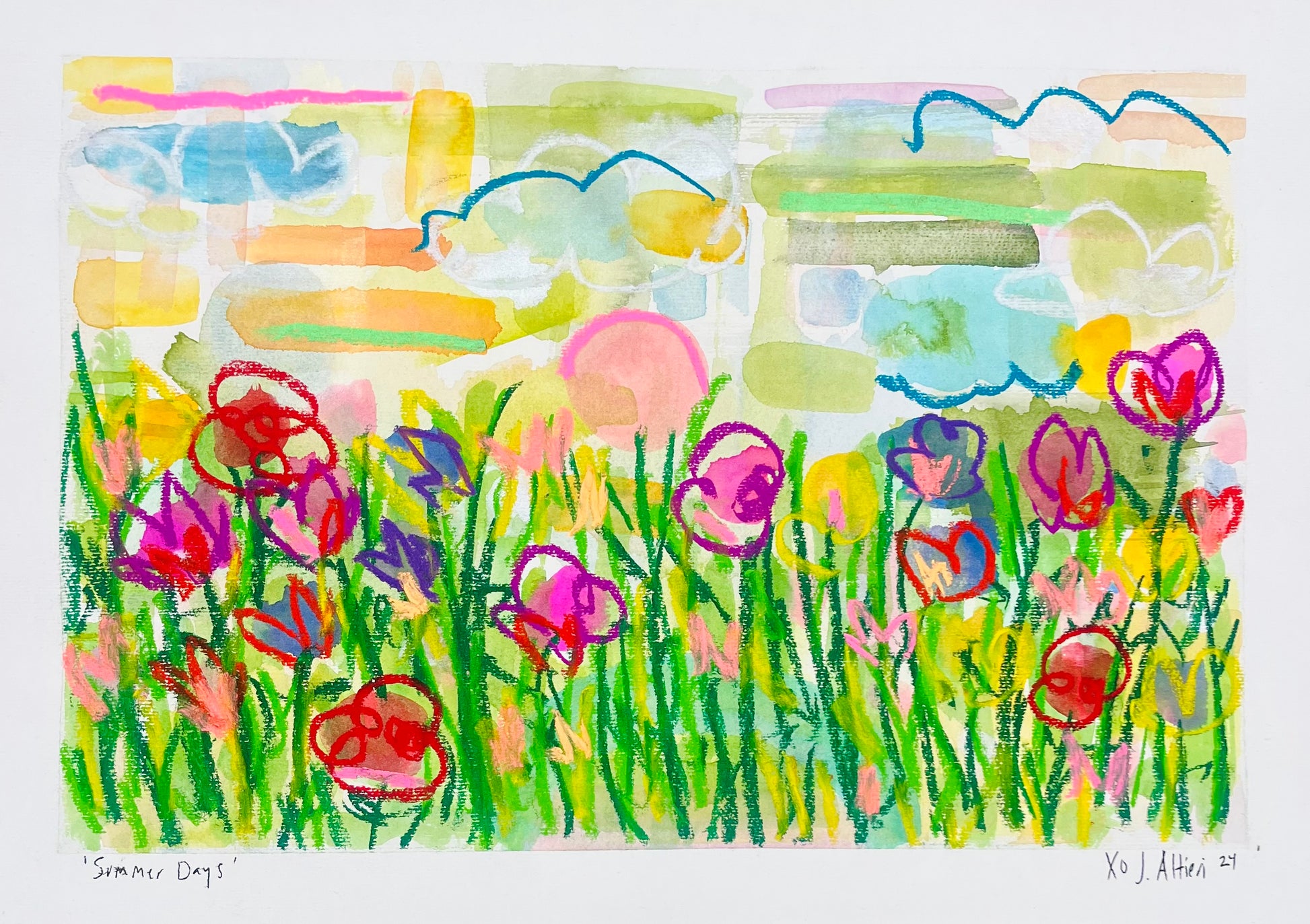 Happy reminder of beautiful days ahead. Original painting including watercolors and pastels ready for its perfect home. You will feel joy and certainly have summer vibes while this is in your space.