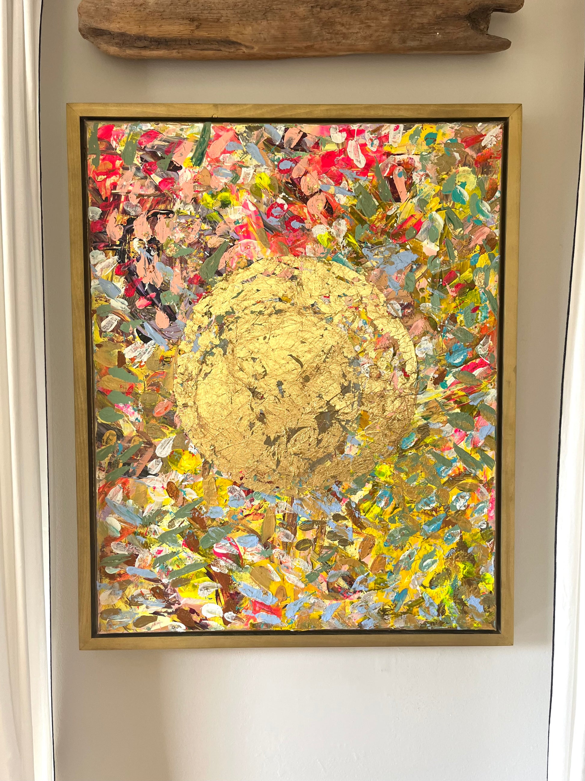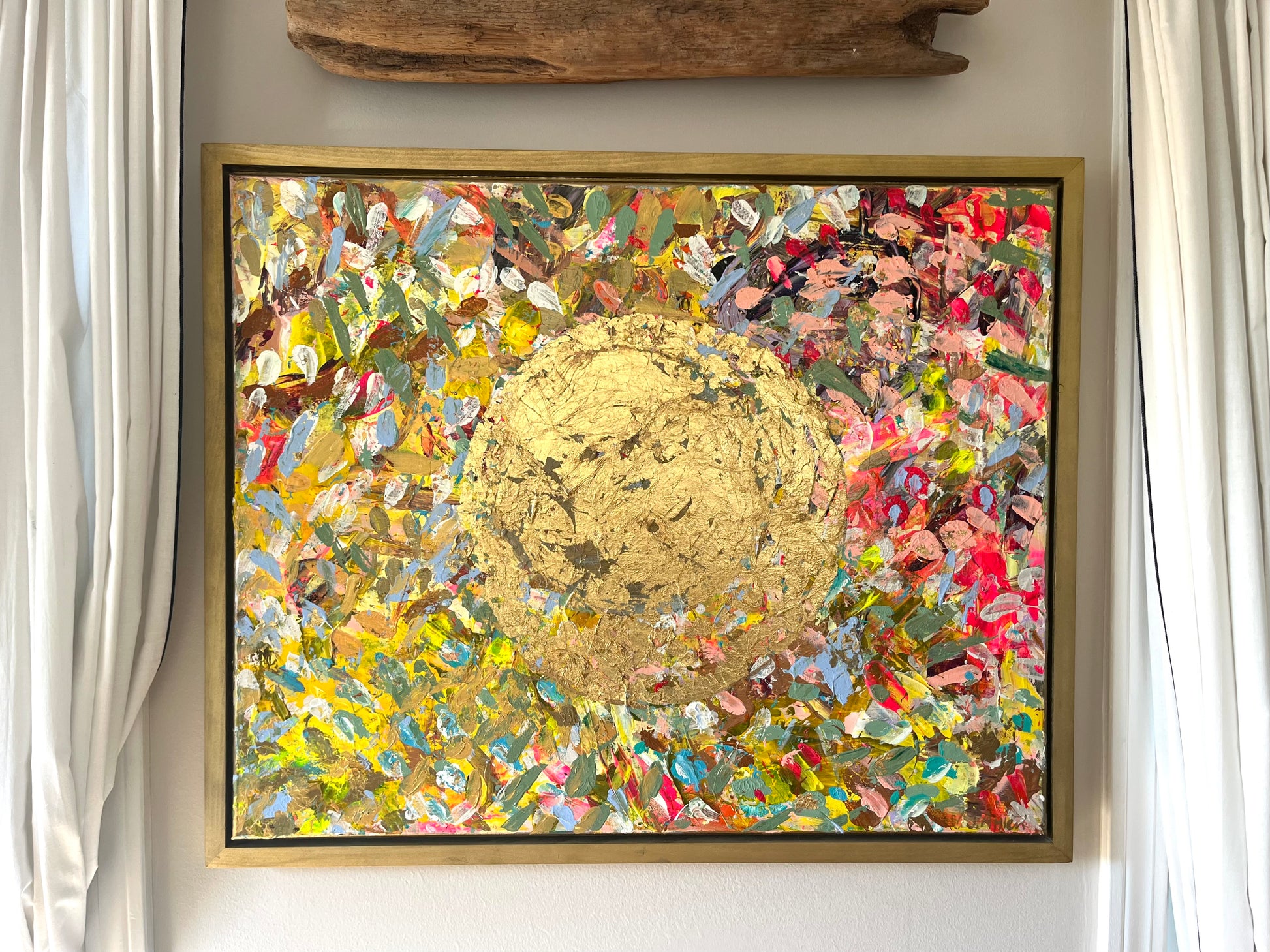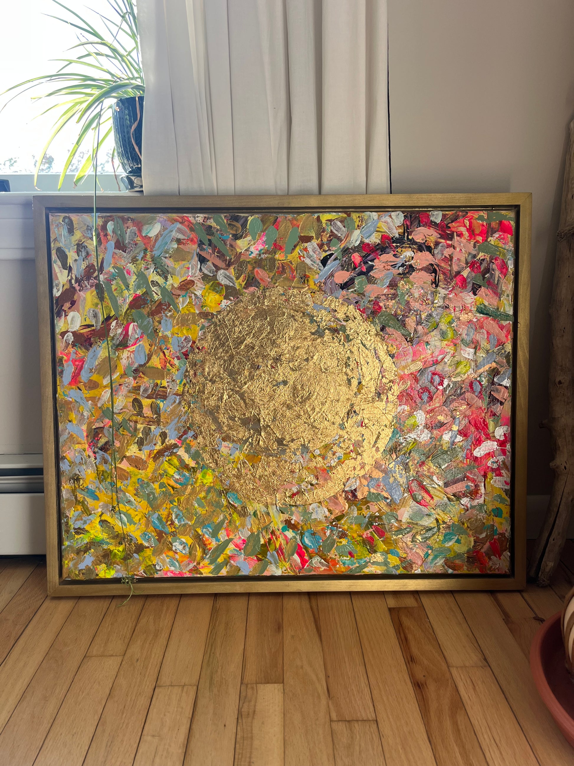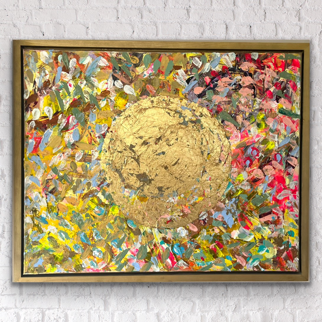 A radiant celebration of light and life, The View captures the golden warmth of the sun in gold leaf, as seen from above — a perspective of peace, gratitude, and wonder. With bold texture and vibrant layers of color, this original piece invites you to pause, breathe, and enjoy the beauty of the moment. It’s a joyful reminder to embrace life from a higher vantage point — where everything glows.