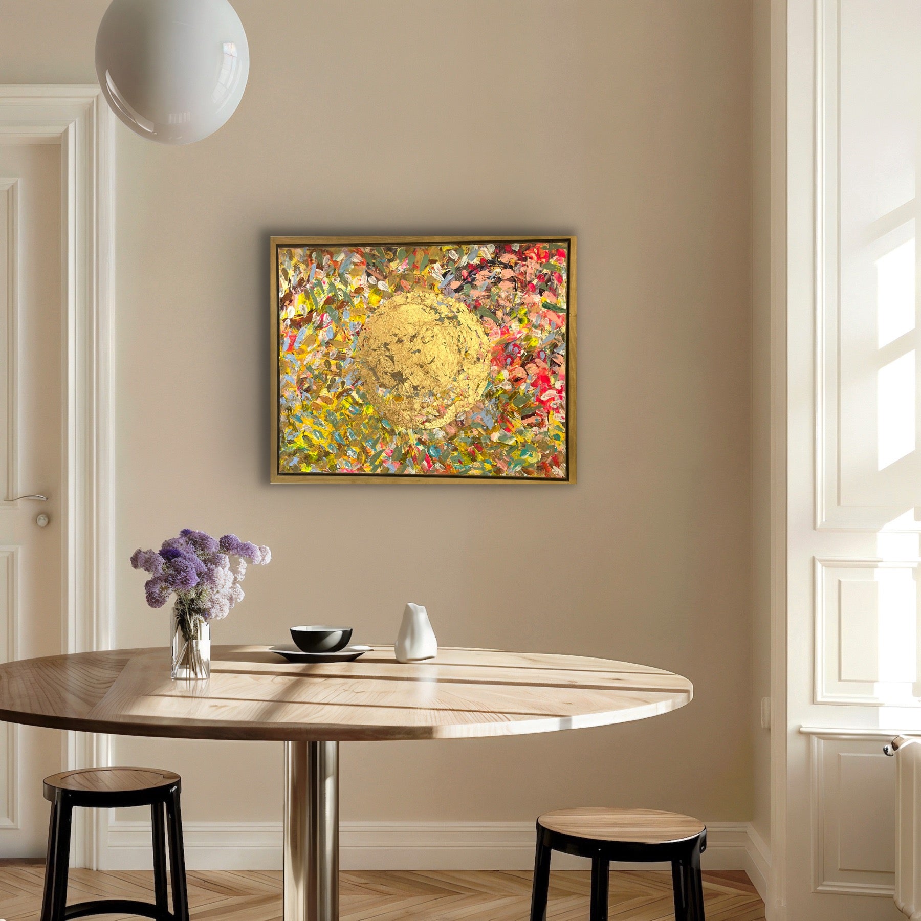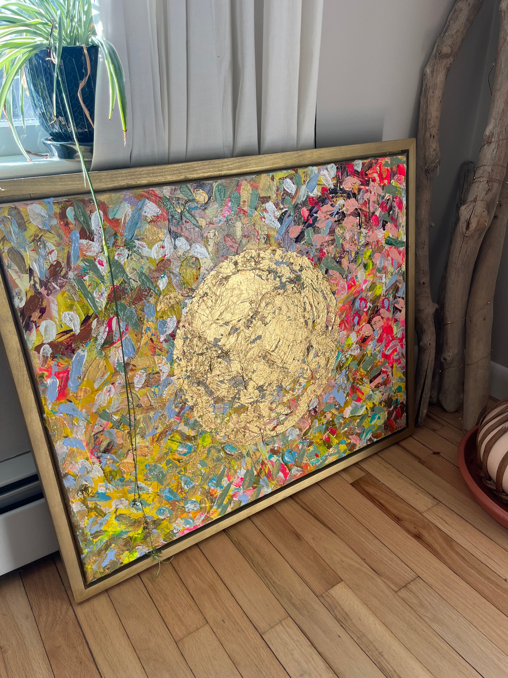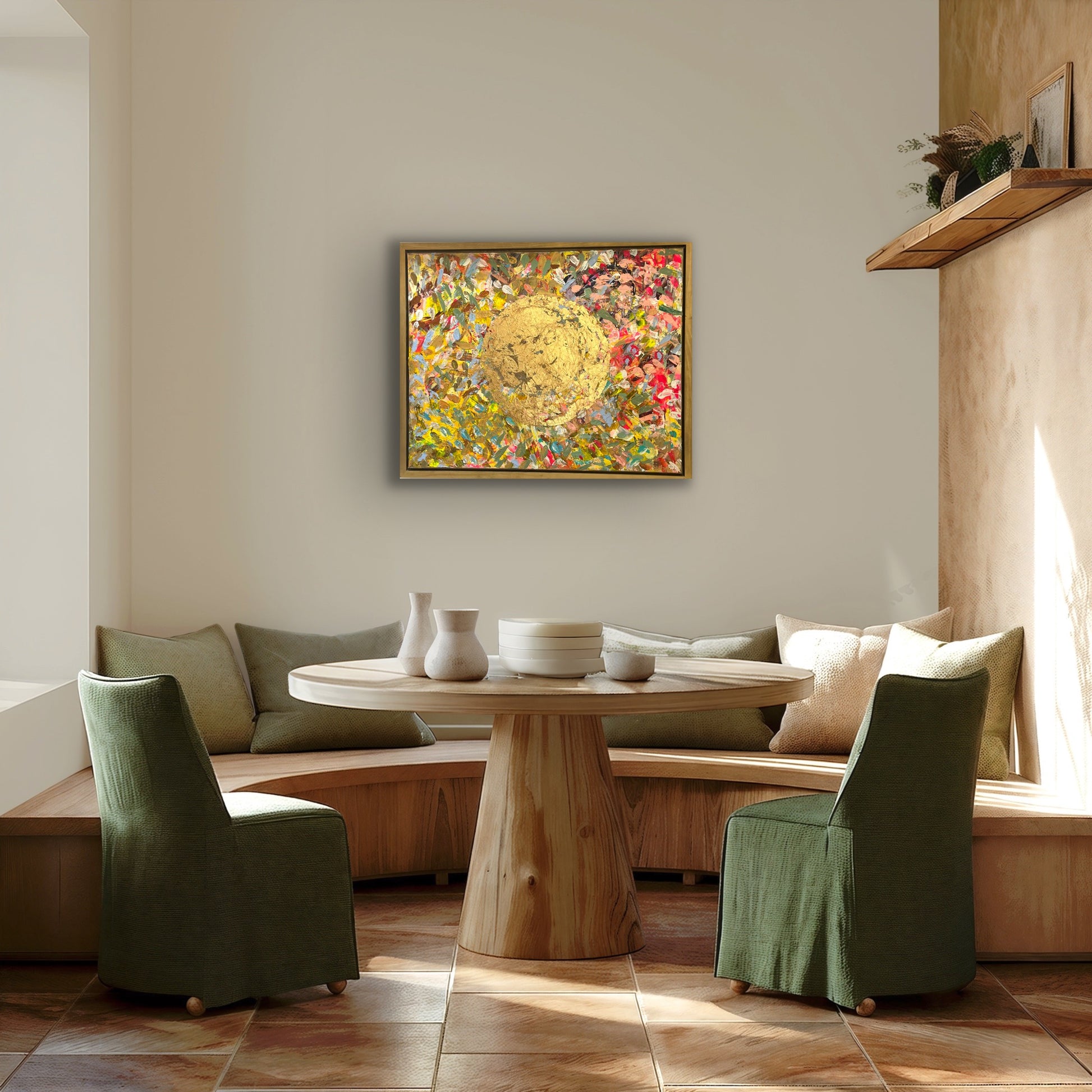 A radiant celebration of light and life, The View captures the golden warmth of the sun in gold leaf, as seen from above — a perspective of peace, gratitude, and wonder. With bold texture and vibrant layers of color, this original piece invites you to pause, breathe, and enjoy the beauty of the moment. It’s a joyful reminder to embrace life from a higher vantage point — where everything glows.