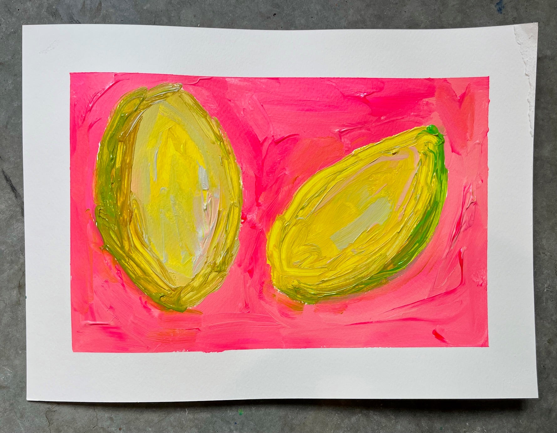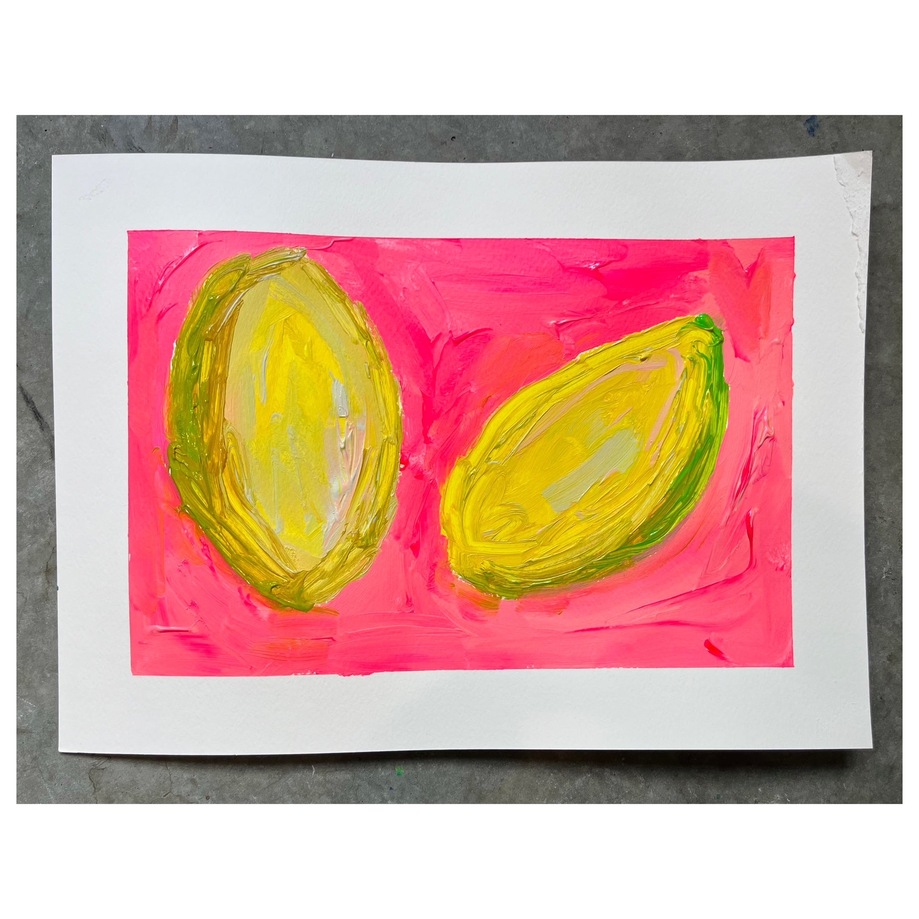 Indulge in the vibrant and uplifting "When Life Be Lemoning" original painting on paper. From the lemon painting series, it serves as a reminder to find joy amidst difficult times. Acrylic on paper, unframed, its playful brightness concocts a light and whimsical touch to any room. comes matted and ready for frame.