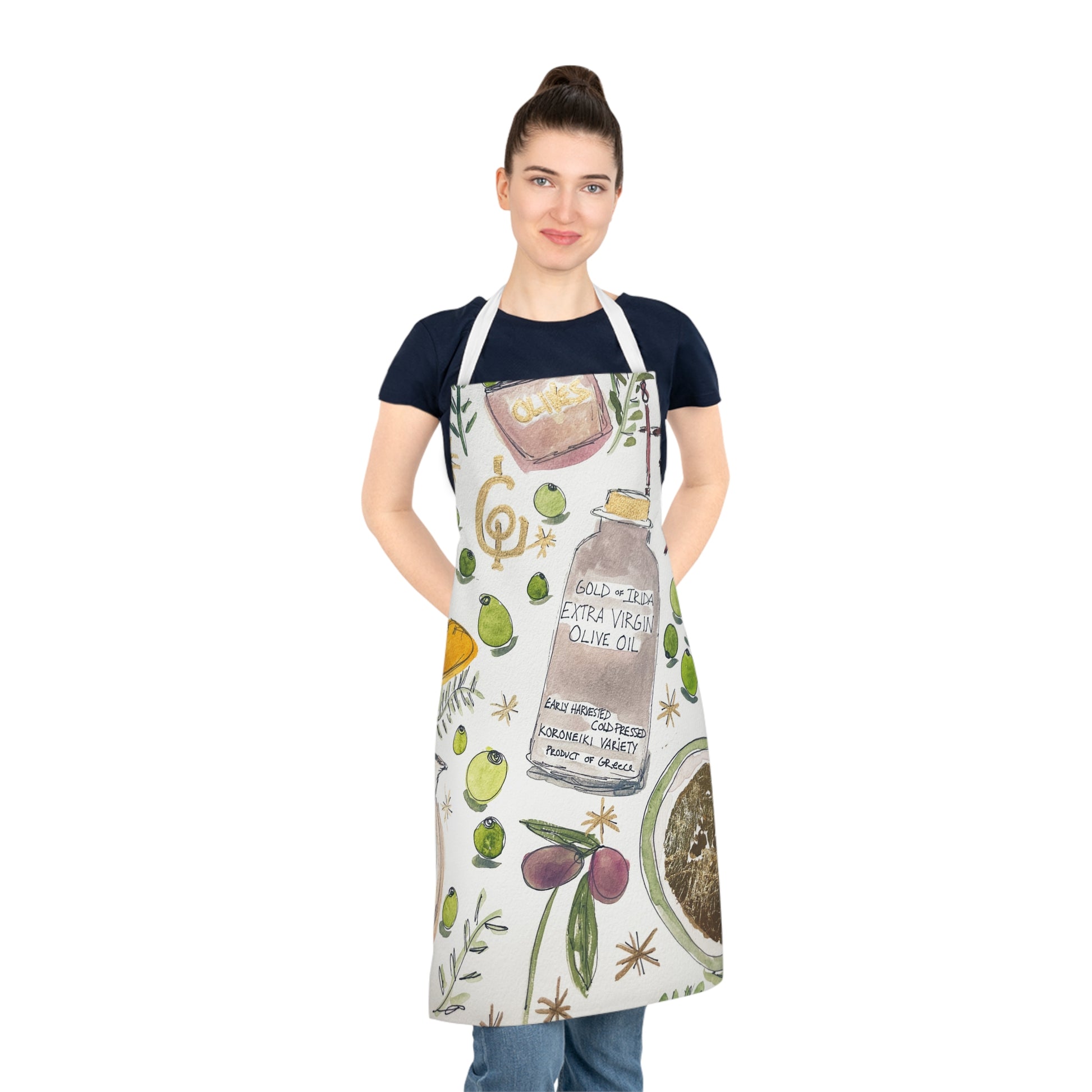 Transport yourself to Greece with this kitchen apron featuring an original painting by Jaclyn Altieri inspired by the 'gold of Irida' olive oil brand. Perfect for those who love vibrant colors and unique designs, this apron is a must-have for anyone wanting to add a touch of Mediterranean beauty to their kitchen. Ideal for those who enjoy cooking, hosting gatherings.