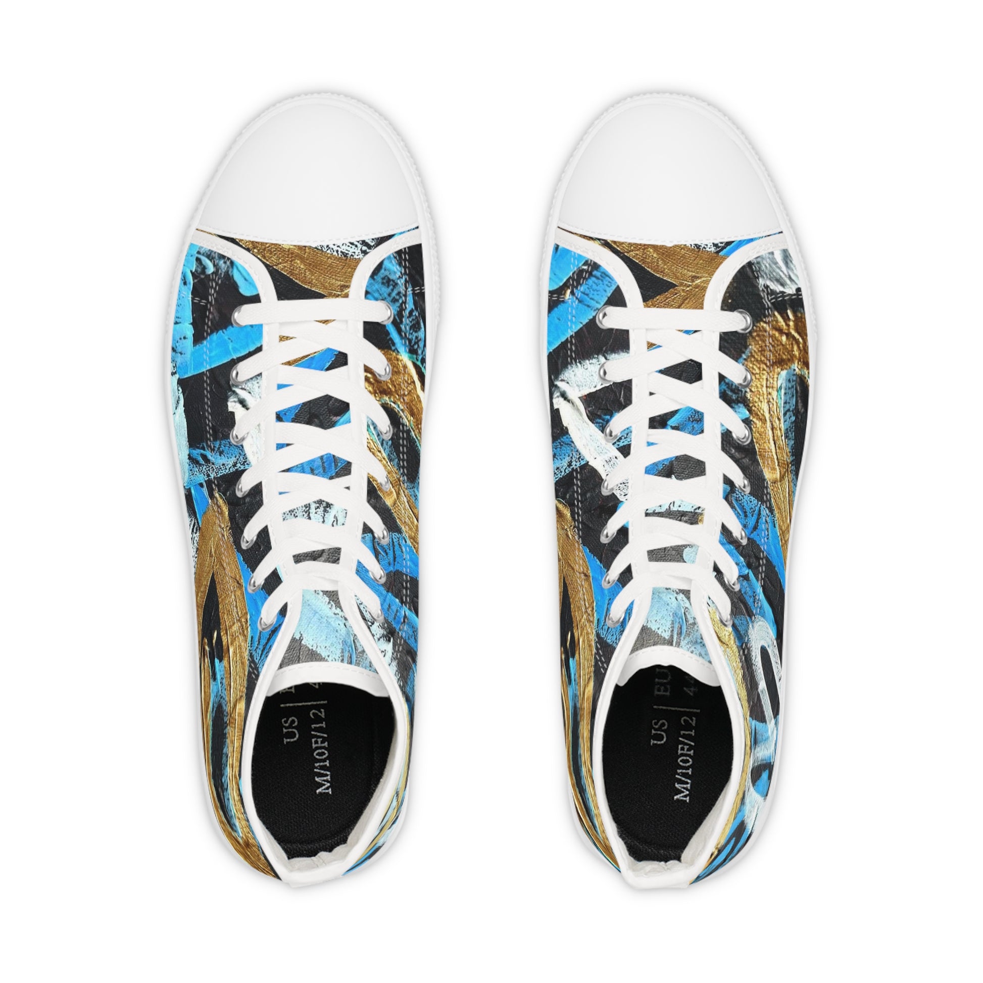Made with breathable polyester canvas and featuring hi-poly deodorant memory foam insoles, these high top sneakers for men bear all the marks of an awesome shoe. Choose between black or white sole and laces, and enjoy the silver metal eyelets along with the lace-up closure. Original artwork by Jaclyn Altieri.