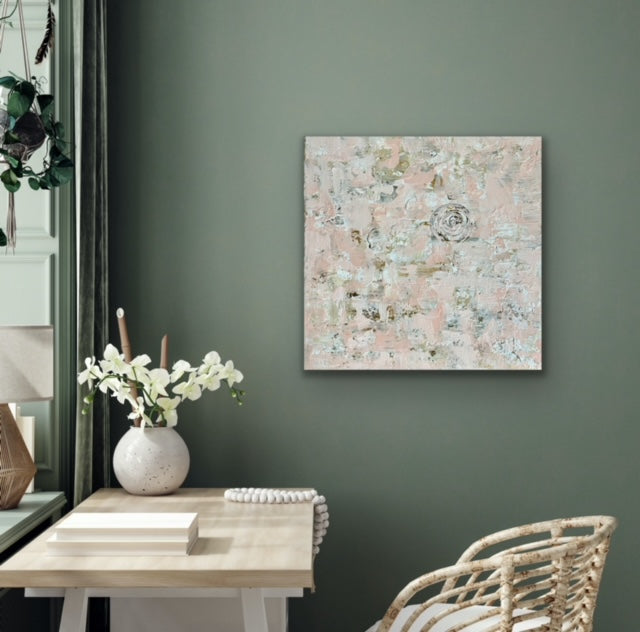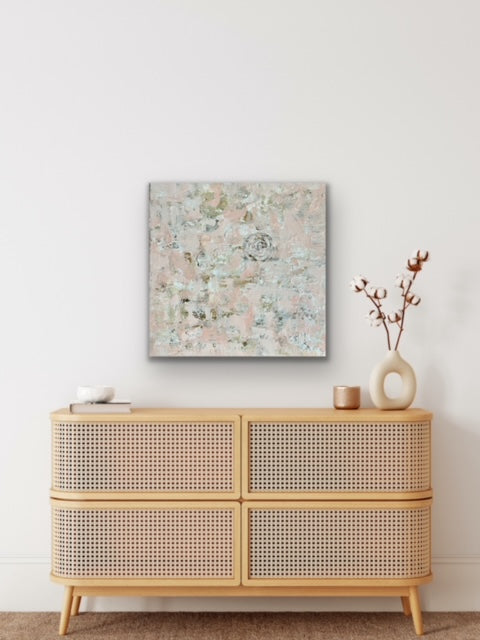 I felt like switching up my pallet on this piece. I wanted to incorporate some lightness and softness into it. It’s layered and textured and fun to inspect.