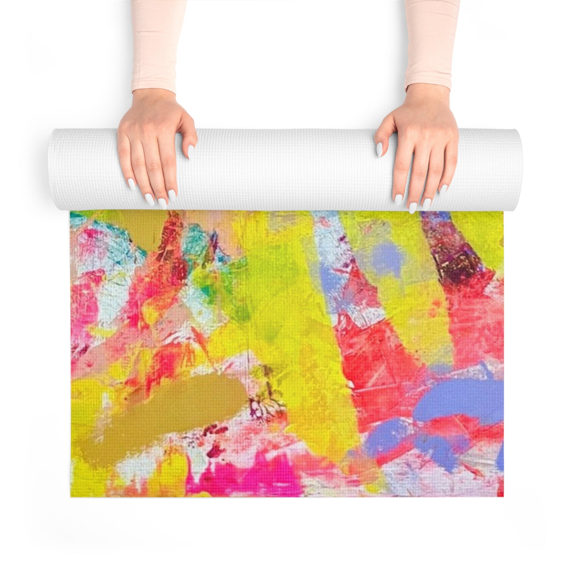 A vibrant yoga mat featuring Jaclyn Altieri's original painting 'Return of Light'. Perfect for yoga enthusiasts looking to stand out in their favorite classes. This foam yoga mat provides stability, a firm grip, and anti-slip texture for safety. The colorful design adds a touch of art to your exercise routine.